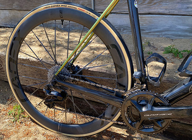 The second wheelset, far more ridden by me, is the training package but it’s more than just that. It’s the maximal comfort, minimal flat, go anywhere wheelset that turns a road bike into a freedom machine. I was riding a lightly-traveled 2-lane mountain road earlier this spring in the vicinity of Yosemite National Park when I saw a sign pointing to a giant sequoia grove 2 miles distant, reachable on a dirt road. I pulled off the pavement and visited these giant trees (a life-changing experience if you haven’t yet seen them in person), and I did so on my road bike because of the wheels I was riding.