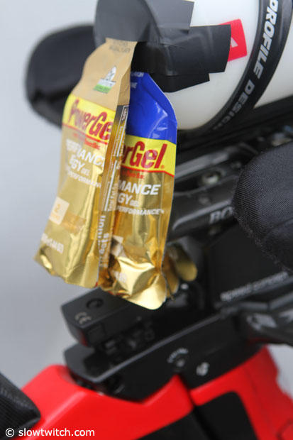 The Shimano Junction A box is just below, and Bretscher has a few PowerGels taped to the Aero HC system.