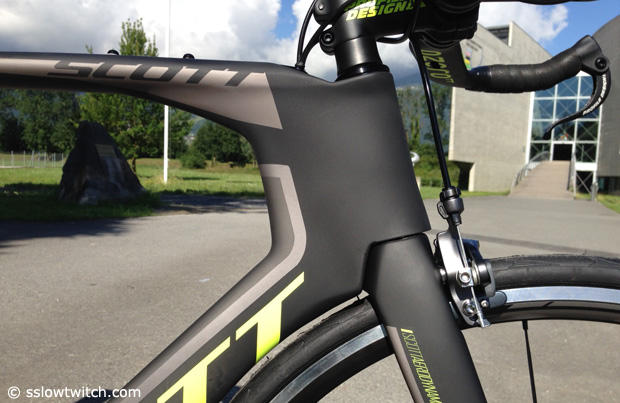 Scott Sports introduced a Plasma 5 and a Plasma 4 at the UCI headquarters in Aigle, Switzerland today and here is a closer look at the higher-end Plasma 5. We had shown pictures of Sebastian Kienle's geometrically camouflaged race bike at Challenge Kraichgau but were not sure then how much of a prototype it was. He soon after won the Ironman European Championships in Frankfurt, Germany on it, and he told us that he loves the system integration, but mostly he loves the handling of this bike with the stiffer numbers. The Plasma 4 and 5 will be available in 4 sizes later this year. You can take the nose cone storage unit off, and actually need to if you want to race UCI events on it. According to Scott, with the nose cone it is 7% faster than the Plasma 3, and without it about 5%.