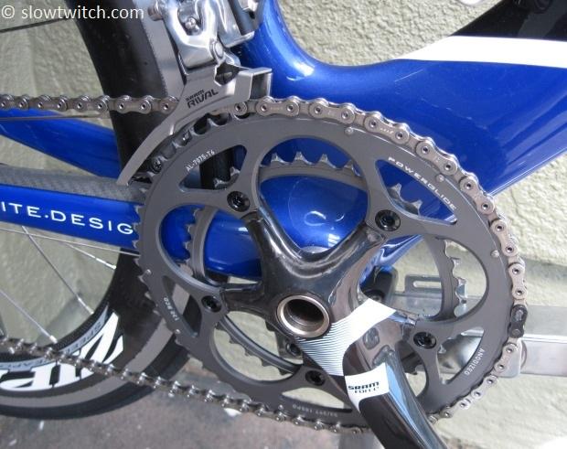 I had two test cases to work with. First was a Cervelo P2C with a SRAM Force 53/39 crankset, Rival front derailleur, and 1091 chain. Second was a Trek Speed Concept with SRAM Force 52/36 “mid compact” crankset, Force front derailleur, and 1091 chain. I intended to swap out the rings for equivalent-size Praxis rings.