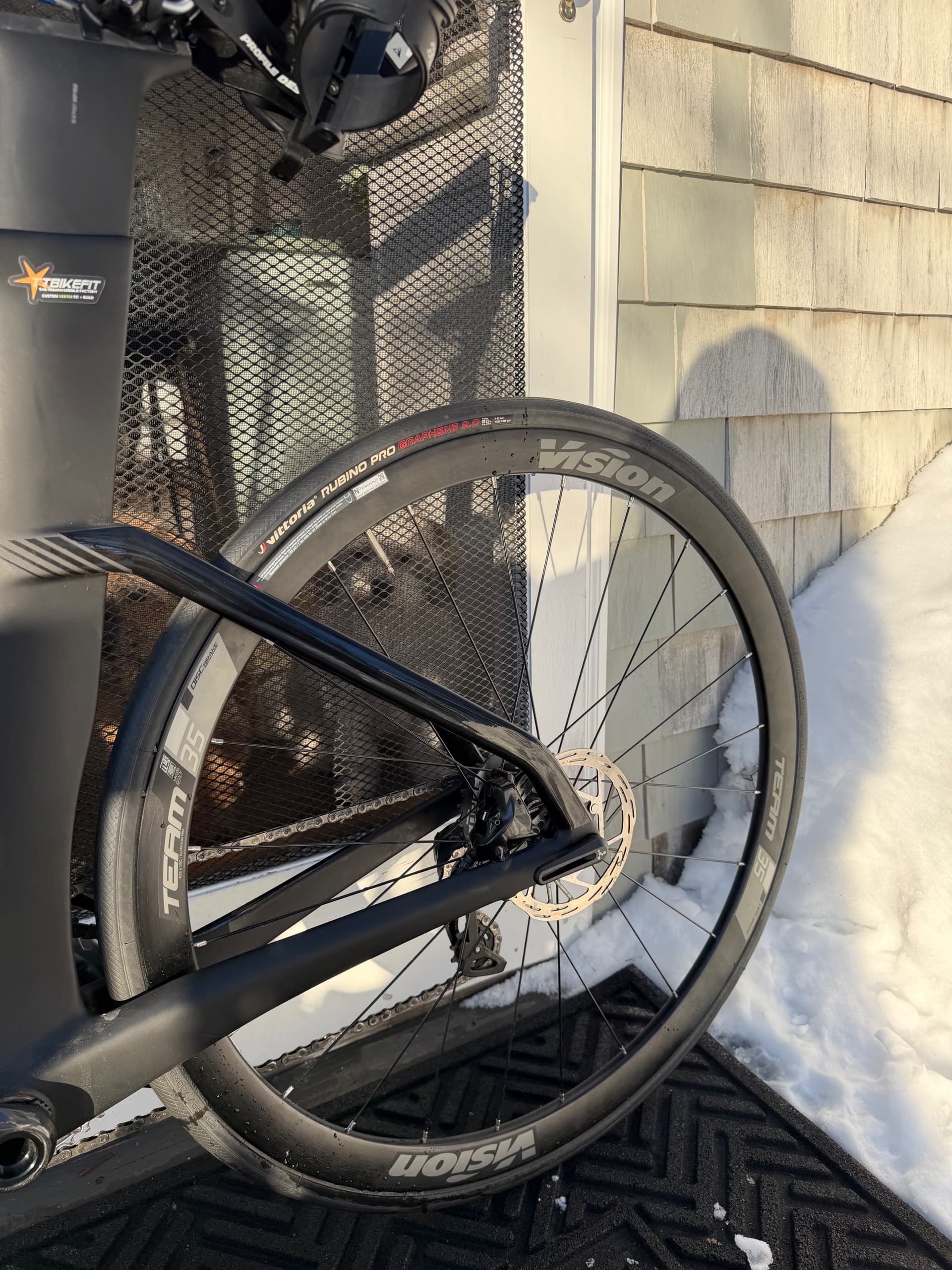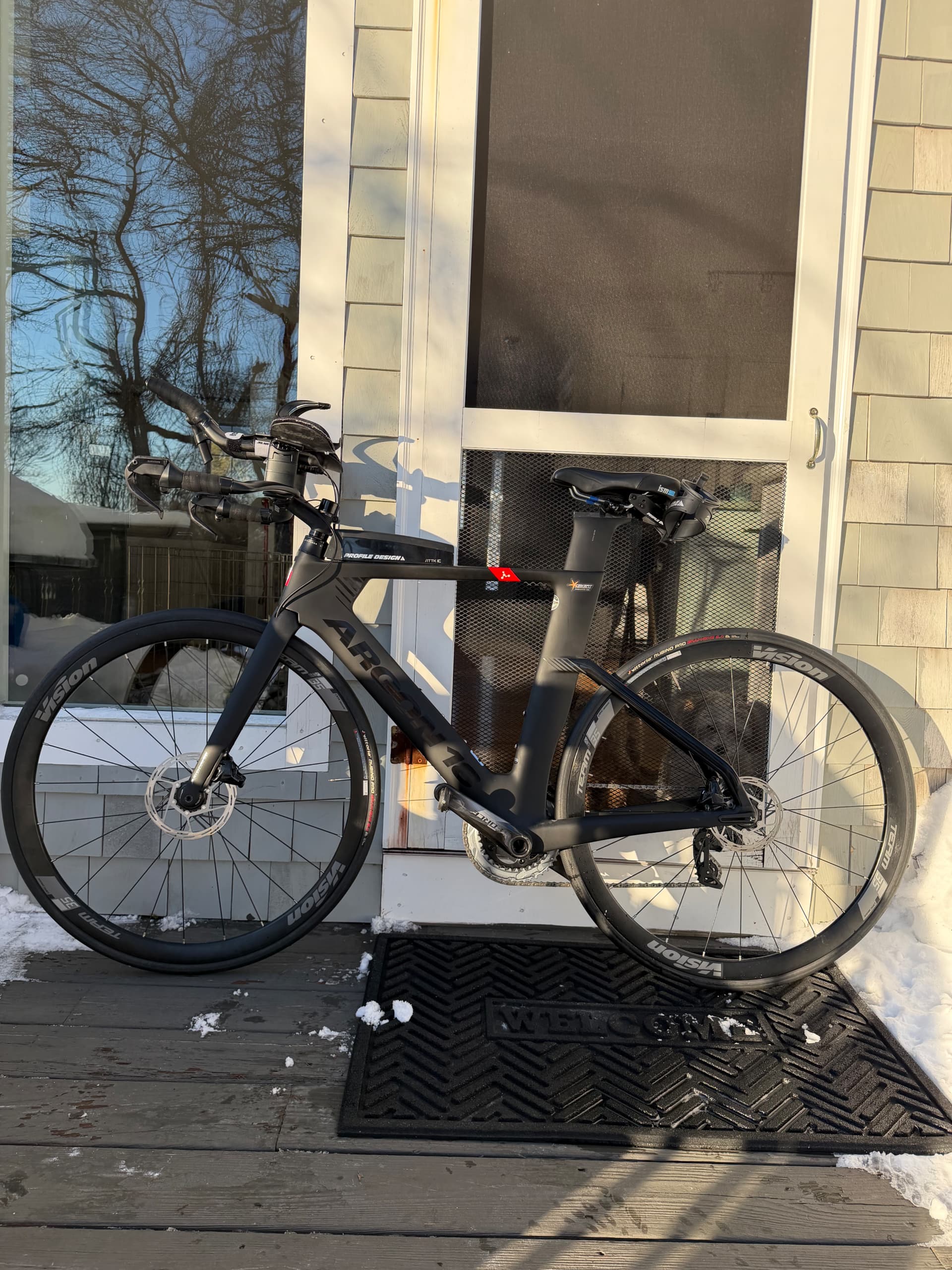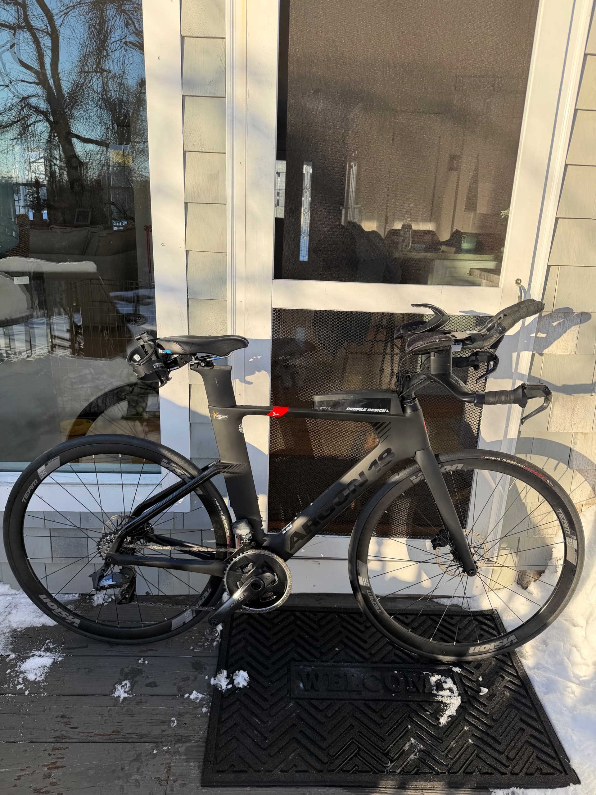 Virtually new triathlon bike with ~3 miles of outdoor riding total. Custom built, never raced, never crashed. Since purchase it has been stored indoors and used only on a Wahoo KICKR trainer.