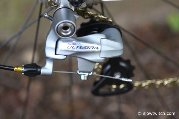 FSA SLK Light 36-46 cranks and an Ultegra front derailleur in the center of the bike.