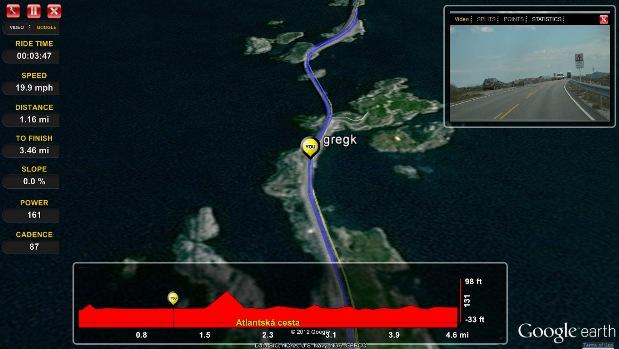 Once you’ve started riding, you can choose to view your ride in a couple different ways. First, we’ll look at a video ride I did – Atlantska Cesta. This view shows the primary screen with the Google Earth top-down view, and the small secondary screen showing the video: