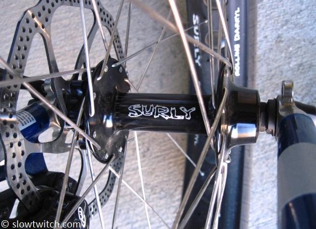 My front hub is the cost-friendly Surly with threaded steel axle. Because it lacks a freehub, it is lighter than using a rear 135mm hub on the front of the bike: