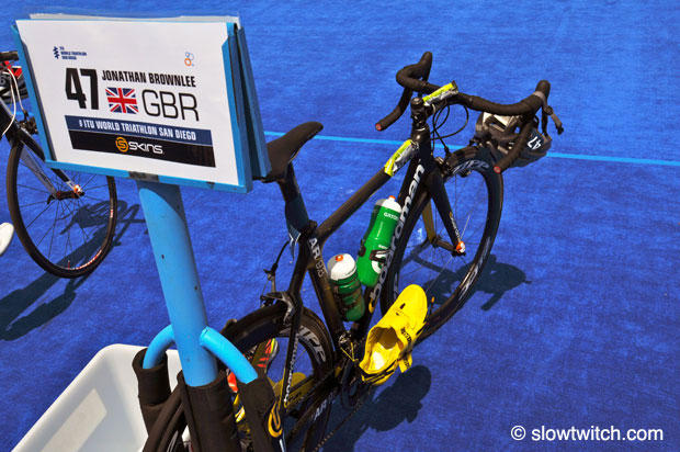 Today we take a closer look at the Boardman AiR 9.8 of ITU World Triathlon Series San Diego winner Jonathan Brownlee. Despite being a phenomenal runner he kept pushing the bike most of the race, giving his sponsor Boardman some very nice airtime.