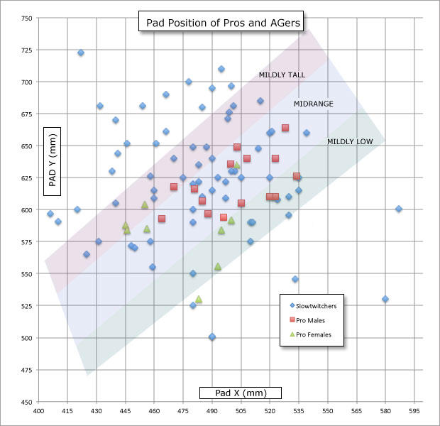Now, one more thing: You must, as a fitter, note which equipment was used to generate these fit coordinates. Any horizontal measure (saddle fore/aft, cockpit distance), whether road or tri, is saddle dependent. Are you a road rider? Did you switch from a Specialized Toupé to a Specialized Power saddle? The nose of the Power saddle probably sits 20mm further behind the BB, without you moving your hips back at all. This also affects any measure from the saddle nose forward to the handlebars. So, fit coordinates are always specific to the equipment used. Vertical metrics are less affected, that is, your handlebar elevation probably didn't change when you changed from one Specialized saddle to the other, but still, your fitter should always note the equipment under you when fit coordinates are delivered. Also, in all cases it’s necessary to know what crank length was used, and the better fitters will have adjustable cranks on their fit bikes that allow the session to be conducted using the appropriate length.