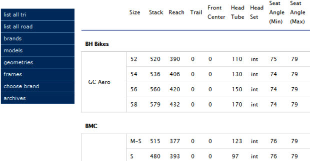 For example, Cannondale Slice and Specialized Shiv have the highest stack/reach ratios in the database of ~1.32. Could I use that range as a starting point? On the other hand, the ‘old’ Cervelo P3 (which is offered by several retailers here at a great price point), has a ratio of ~1.20, which suggests that the proportions might be too long for me, despite the excellent cost value.