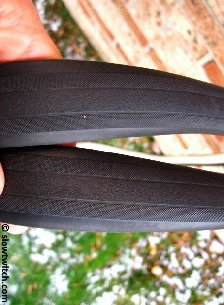 In contrast, rolling resistance is the amount of energy that the tire ‘soaks up’ when it gets deformed on the road surface – and then returns to shape as it leaves the road surface. Many things come in to play here, such as rubber compound, tread thickness, the type and thickness of anti-puncture layer, tire width, and so on. I honestly don’t know if it is possible to have a compound so soft (e.g. with high cornering grip) that it actually sticks to the road like glue and causes an effective increase in rolling resistance. With such a small contact patch on a bicycle tire, I’m guessing that any differences here are very small.