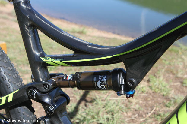 Up close with the rear suspension setup of the Pivot Mach 4. The Fox Float CTD Kashima rear shock offers 115mm of travel.