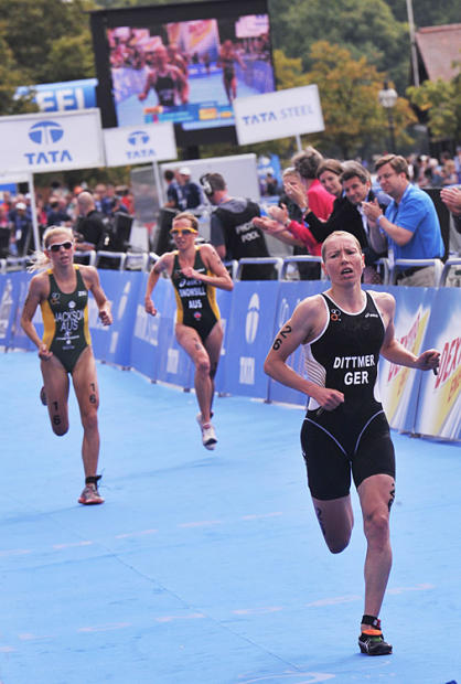 The Dextro Energy ITU World Championship Series races are always exciting. But mix in the fact that this was a test event for the 2012 Olympics in London and Olympic qualifying was on the line for a raft of contenders from around the world, the pressure and the electricity got a turbo boost of epic proportions. When Olympic qualifying is factored in, surprises reign. Gwen Jorgenson's 2nd place finish and Olympic qualification was the biggest shock. But so was the fact that long time US stars Sarah Haskins and Laura Bennett came out on the short end with disappointing races. They were topped by Jorgensen and the hard working Sarah Groff, who took U.S. slot number 2 with a 7th place finish and was beaming with quiet pride afterward. More surprises included the fact that the 1-2-3 finish a few weeks ago of the three Aussie Emmas at Hamburg would not be repeated, as Jackson (4th) Snowsill (5th) and Moffatt (15th) all had off days.