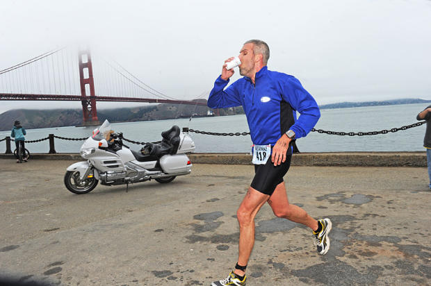 Peer-Timo Bremer of Livermore California hydrates on his way to a 3:23:28 – 10th in 35-39.