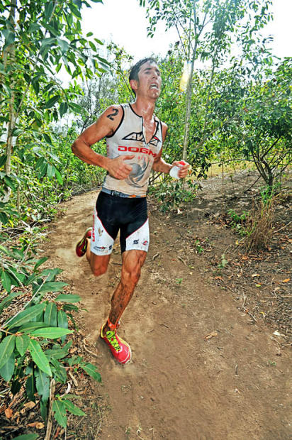 Pro Mike Vine fights his way past an age grouper on a narrow trail.