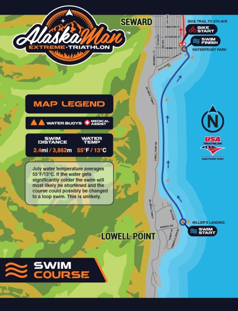 The swim takes place in Seward, AK in Resurrection Bay, which according the race organizers typically features calm water that – aside from the cold temperatures – are ideal for swimming. Athletes will start south of Seward at Lowell Point and enter the water at Miller's Landing before swimming north along the shore to exit at Waterfront Park in Seward.