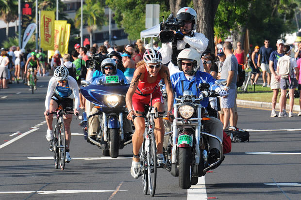 Starting her day well back thanks to injuries suffered in a pre race bike crash, Chrissie Wellington rides up Palani at the head of her media entourage on her way to a 4th Ironman Hawaii victory.