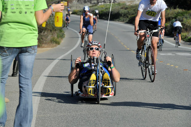 A physically challenged competitor rides the Pacific Grove Olympic distance race.
