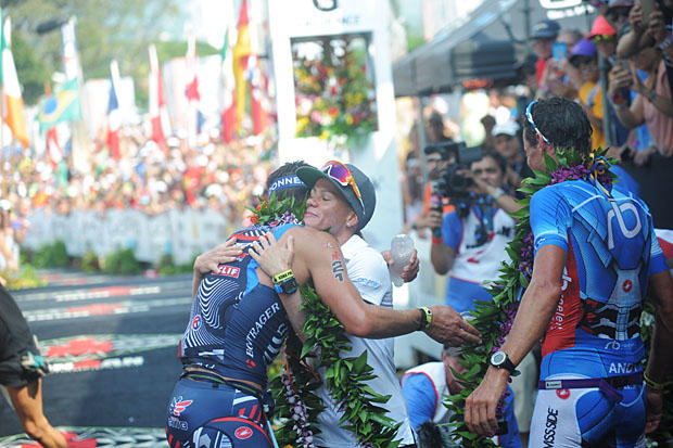 Twenty-first place finisher Jordan Rapp embraced his good friend Andi Bocherer, the 20th place finisher, after a day in the hot Kona sun.