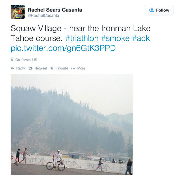 According to Ironman, "Saturday’s King Fire projections had suggested that smoke and particulate matter would not impact the event on Sunday. However, fire behavior and wind patterns changed significantly on Saturday afternoon with air quality at Squaw Valley, Truckee, and Tahoe City deteriorating rapidly through the course of the evening. Smoke models predict little relief on Sunday with smoke accumulation increasing as the day progresses, according to the anticipated shift to a southwesterly wind."