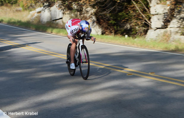Daniela Ryf pulled away further and further and was flying down the descent. A nearby speed trap clocked her at 42 miles an hour on that gentle down slope.