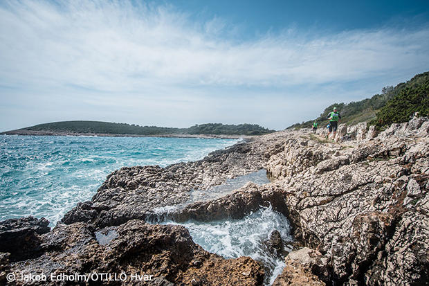 The French mixed team of Caroline Dewaele and Nicolas Dewaele run along the coast near Hvar on fairly tricky terrain.