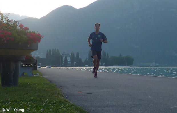 It is very easy to take your running gear along on business trips and not only get a workout in but also explore the area . Here Will Young enjoys a run in Annecy, France.