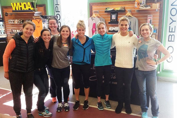 Erica Jesseman (second from right), Kristin Barry (third from right) and Sheri Piers (fourth from right) shared their experiences of running in the US Olympic Trials Marathon which was highly entertaining. Here they are seen huddled together with the friendly and helpful Fleet Feet staff following their talk.