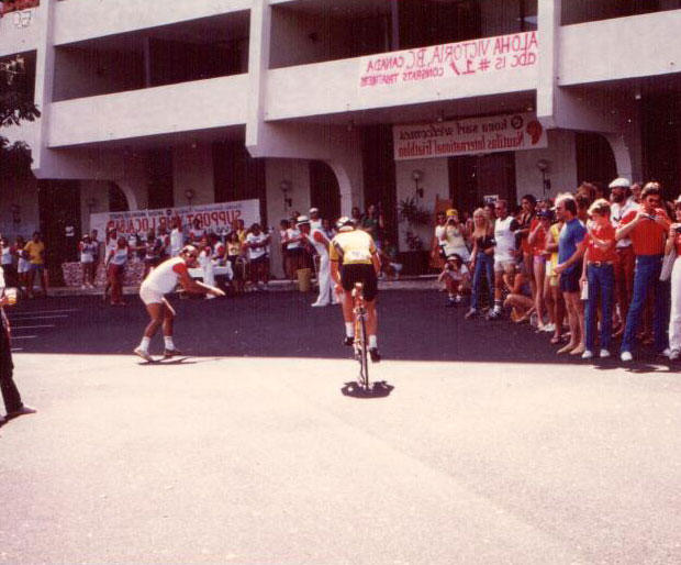 That first Ironman held in Kona, in 1981, attracted 326 contestants, more than triple the number that showed up for the last of the 3 races in Oahu in 1980. As some observers know, we have a sport for 2 reasons, beyond the fact that it’s just a great activity. Reason 1: the media liked it. The 1979 race was written up in Sports Illustrated in a way that caused the production team at ABC’s Wide World of Sports to send a crew over to film the thing. Reason 2: Just when ABC thought this oddity might have run its course, Julie Moss collapses in a heap, yards from the finish line in October of 1982 and history is made and that race has never not been nationally televised since. The race entries went from 300+ to 500+ to 800+ from February 81 to February 82 to October 82 – the race was held twice in 1982 as it moved to October. Entries and interest continued to climb unabated. The next two images below are of me coming in off the bike at T2, and that race had a split transition, with bike-to-run happening at the old Kona Surf Hotel in Keahou.