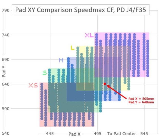 That colorful thingy above, that is a Cartesian representation of the pink shaded area in the geometry chart above that. Sometimes graphing this makes it easier to see how bikes will fit. See that red circle? That's me. That's a Pad XY, to pad-center, of 640mm (pad rise, from the bottom bracket) x 505mm (pad run). See how I'm in the yellow shaded rectangle? Because my circle is right in the middle of it (horizontally), that means the length of the bike fits me perfectly, as is, bolts in the center of the armrest's 3 holesets, with the stem that comes on the bike. No $99 purchase needed for me! But if i was 10mm or 15mm off one way or the other, then I decide whether to pull the pads back or forward, or buy another stem. See? Now, that 640mm of pad height, that's 13mm above the floor of the bike's adjustability (with that aerobar). So, I'd add maybe 15mm of pedestals under the armrests and, presto, I'm pretty much bang on. I could ride this bike very easily.