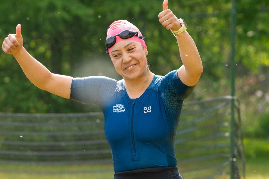 Happy to finish her first triathlon swim at the Gravenhurst Triathlon. Photo: Kevin Mackinnon