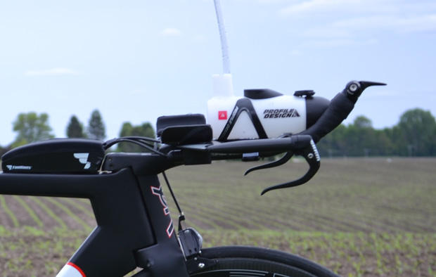 Hanson has a Profile Design BTA bottle and SRAM brakes and shifters on his TriRig base bars with Profile Design extensions. He rides a HED GT3 wheel up front with a Zipp Tangente SL Speed 24mm tire.