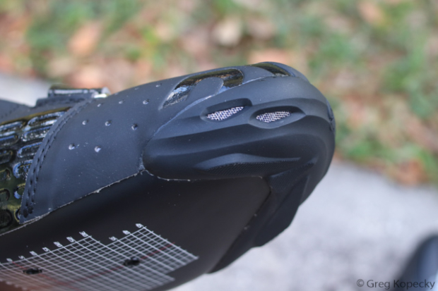 You’ll also notice in the photo above that the carbon fiber base of the shoe wraps high around the back of your foot. This lends to the shoes having a stiff feel, but thankfully they didn’t feel too stiff. As a comparison, some of the Mavic shoes are rigid to the point where it feels strange to some folks due to the lack of any movement whatsoever.