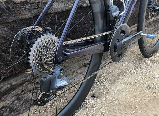 The dust cover turns too. This is the case with a lot of fancy bikes these days. It’s in-line with the frame until you turn it. Then it’s not. Whatever. Just, round is always in-line, regardless of whether the wheel is turned or not. I know, I’m sounding like the guy who says, “I’ll just drive the 1966 Chevy pickup; it’s fine for my needs,” but quite honestly the Caledonia is fine for my needs. I don’t need the Cal5. The one thing that I wish, though, is that I could get that drivetrain on a Caledonia frameset. I really like the SRAM Force eTap with 12sp and 30×36 as the low gear. I carry a spare battery with me in the behind-the-seat bag in case one of the derailleur batteries takes a dive.