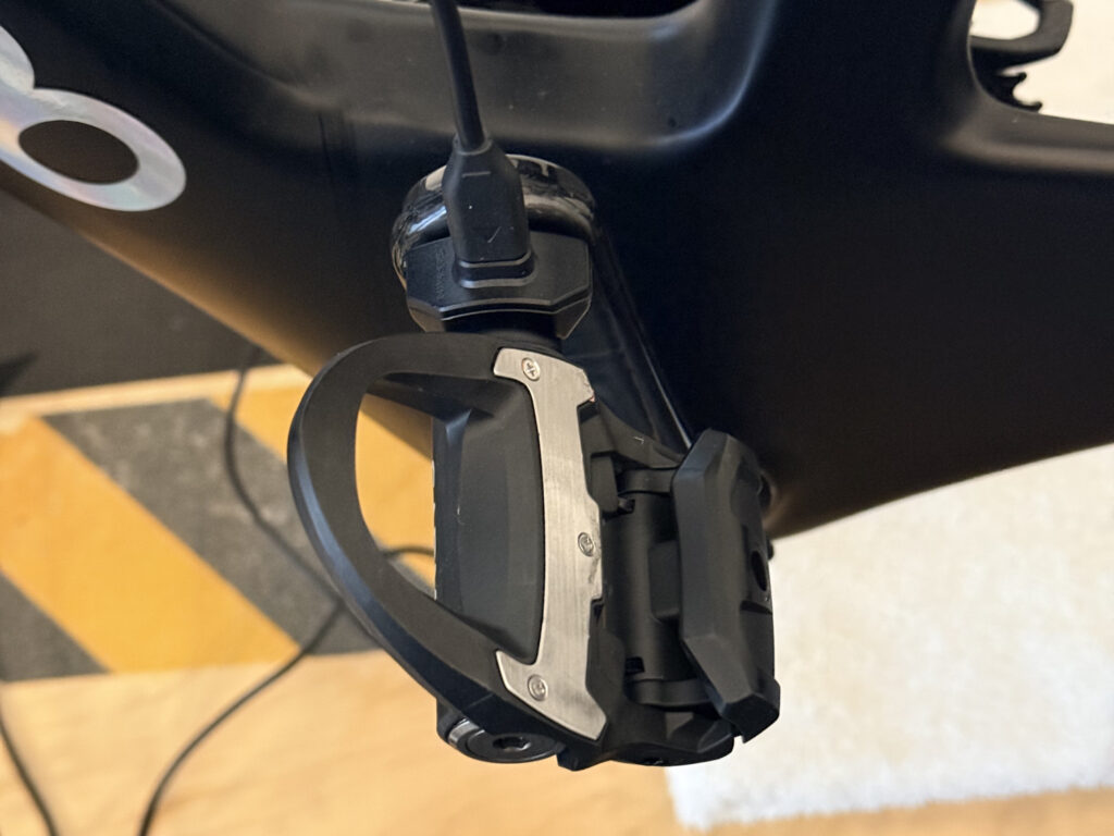 Inside the box you get a couple of USB-C cables and two small magnetic charging clips that snap onto the pedal. The magnetic clips have some strong polarity, so you get a satisfying “click” sound when the charging nodes engage. You can also charge the pedals on or off the bike, and any USB-C power source works — wall brick, laptop or a power bank when you’re on the road.