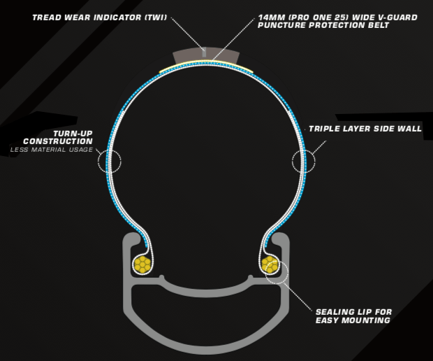 The major changes in the new Pro One versus the old are in shape, diameter, materials and construction concept. The turn-up scheme is different, as you can see. There are 2 layers of carcass instead of 4. The breaker (puncture layer) is 40mm wide. The “compound” (think Black Chile) has changed. It’s called Addix.