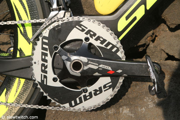 The strong German pushes 175mm SRAM Red cranks with a 55 tooth big ring (42 inner), and is not using a power meter. Cassette is 11-25.
