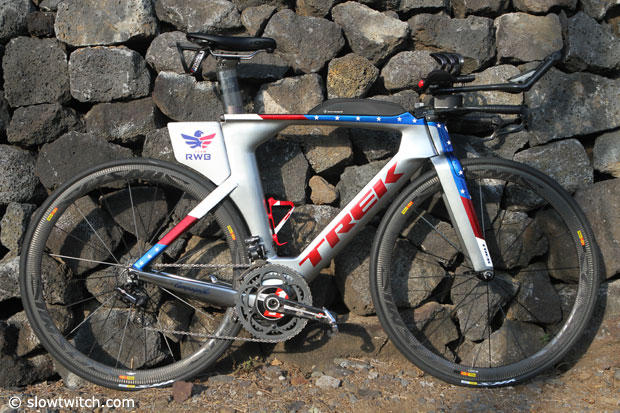 The Captain America themed Trek Speed Concept of Timothy O'Donnell is certainly an attention getter and I looked closer at this Campy equipped custom bike at the 2014 GoPro Ironman World Championships.
