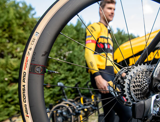 While the Corsa Control Pro is the “classics” tire I question whether that tire is used in the pro ranks. In the images I’ve seen, including this one of a Jumbo Visma bike, if a tire is ridden in a 28mm size or larger (this one is 28mm), and because of the time of the year, I’ll wager this is a spring classics use case and what I see here is Corsa Pro. I believe this is your and my race tire in an IRONMAN (if we’re racing a Vittoria) and the Corsa Control is my tire when I’m way off in the boonies, on questionable asphalt, and out of cell phone range. (Which is my idea of a spring classic.)