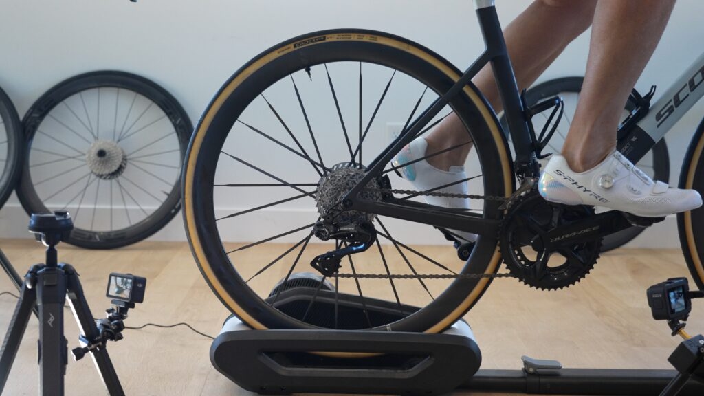 Each wheel/tire combo was mounted on the rear wheel and placed on our Wahoo KICKR ROLLR.