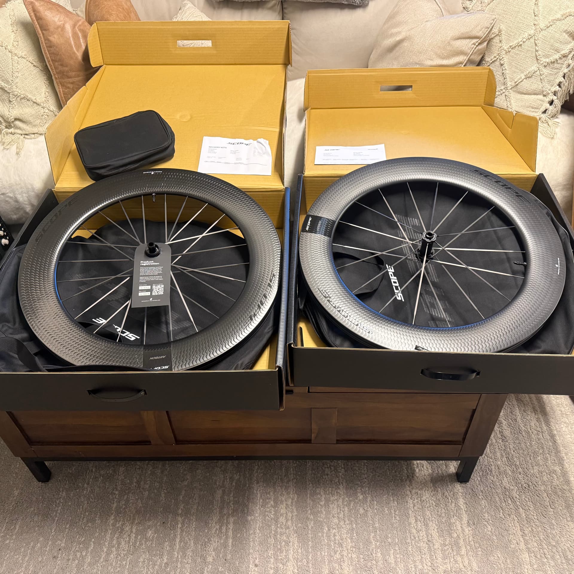 $4000 New in Box! Scope Artech 8.T – set (Shimano) Hiya friends! These need a home in the states. I purchased them for my fall races however because of customs nightmares they did not arrive in time so I went a different direction. Black logos Shimano hub (Pls don’t ask about SRAM… I have no idea if it can be converted) Wheel bags, maintenance kit, COA all there Original receipts. You don’t need to pay customs now since I did that for ya. Get them in days rather weeks to months and for hundreds less.