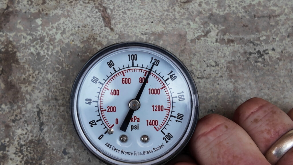 First we would seat the tire onto the rim – without any sealant. Then we would deflate the tire and install the wheel in the chamber, making sure that the wheel was suspended. Then we would use a compressor and gauge to slowly inflate to the maximum pressure for our test – between 118 to 120 PSI. (I give a range because of the type of gauge we used.) And that was it. We didn’t wait for hours, or days. We simply followed that protocol and moved onto the next.