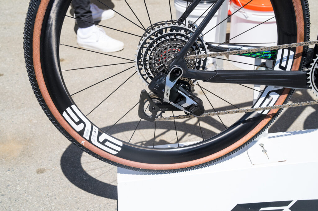 The bike includes SRAM’s RED XPLR AXS with the Power Meter gravel 1 x 13 drivetrain. There’s a 10-46 tooth cassette.
