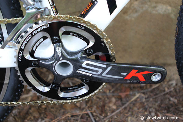 FSA SLK Light 36-46 cranks and an Ultegra front derailleur in the center of the bike.
