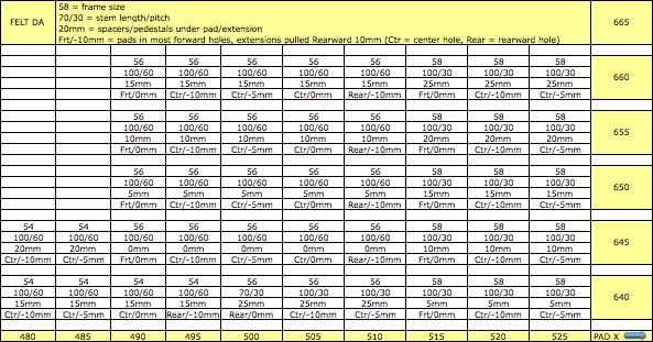 First you need one root bike. Any bike. Any size. Let's take a Felt DA, size 56cm, with Felt's handlebars an one of Felt's 1-piece stems (any of its stems). Stick this bike on a trainer, level it, measure x and y from the BB to the armrest. Accurately.