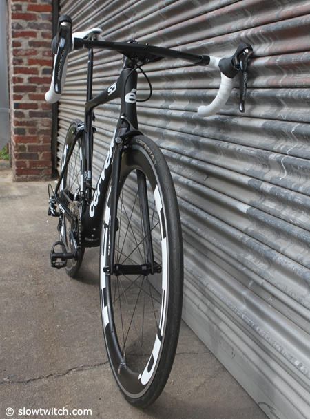 The Shimano Dura-Ace mechanical controls are mounted to the Cervelo aero road bar.