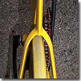 The fork was made entirely of steel, but of very thin tubes. It wasn't especially light, but it had a small profile, like the old, cheap forks on Schwinn cruiser bikes made in that company's Ashtabula factory. The old Ashtabula forks were extremely heavy, but to my knowledge have yet to be bested in the wind tunnel except by the now-recalled Hotta forks, and the Lotus fork. Certain of today's forks—perhaps the Cobb-designed Oval, and Reynolds Ouzo Pro Aero—may again start to challenge the numbers generated by these older forks.