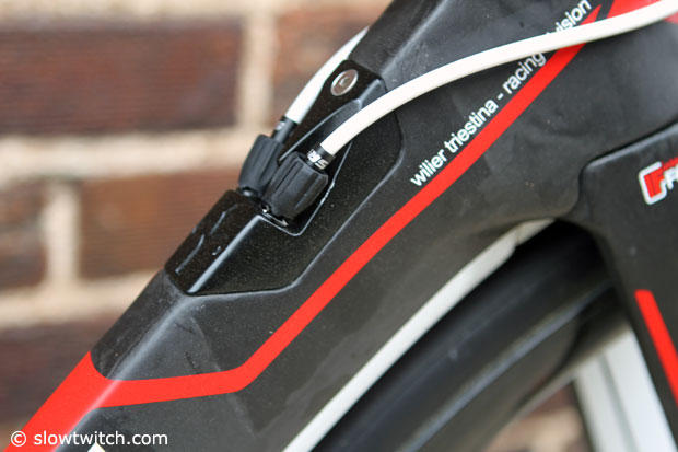 The fork of the Wilier Cento1Air with the distinctive orange timing chip.