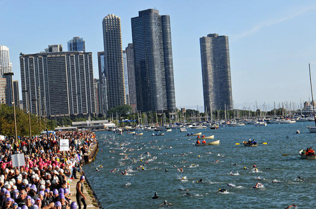 The signature vista of the Chicago Triathlon: Monroe Harbor and a ring of high rise condominiums and office buildings invaded by thousands of triathletes.