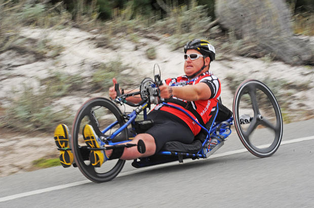 Physically challenged triathlete jamming on the downhill