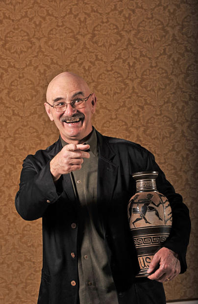 Carl Thomas shows some of his old swimmer's athletic grace miming the Heisman Trophy pose with his Hall of Fame vase as football.