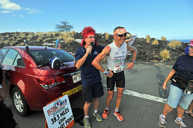 Assured of third place, but thanks to a mistake-filled first day too far back to challenge Ribeiro and Coughlin, Miro Kregar stops at the 39.3-mile checkpoint for a picture with race announcer Steve King.