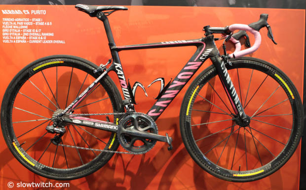 The very petite and beautiful Canyon Aeorad CF of Joaquim Rodriguez is displayed in the Canyon booth. Well, one of them is. He is currently leading the Vuelta on another one.